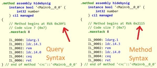The only difference in the two resulting executables is that the LINQ provider optimizes away the last .Select(number => number) statement (since it's a functional no-op anyway), in the query syntax version. Notice how the offset of the one compiled from the second example is slightly further along - that's to make room for the Select(number => number) method call.